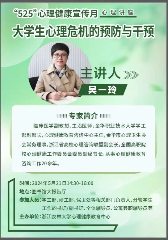 大学生心理危机的预防和干预2024年5月21日14:30-16:00