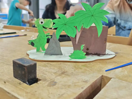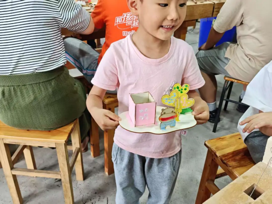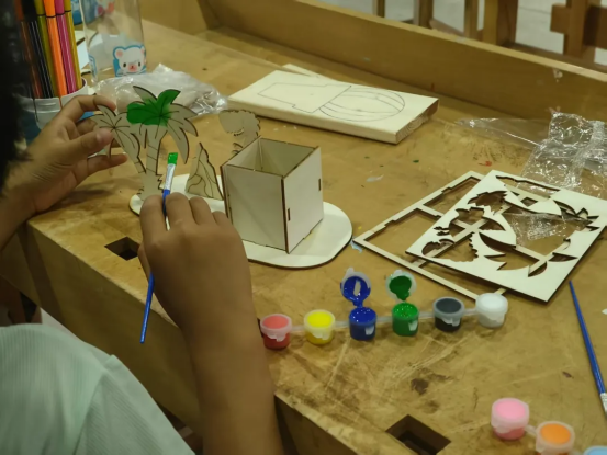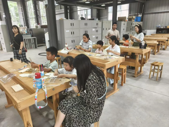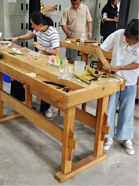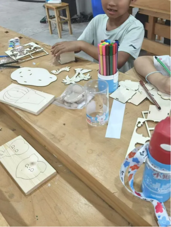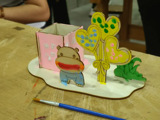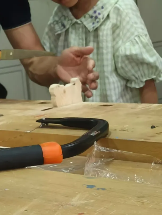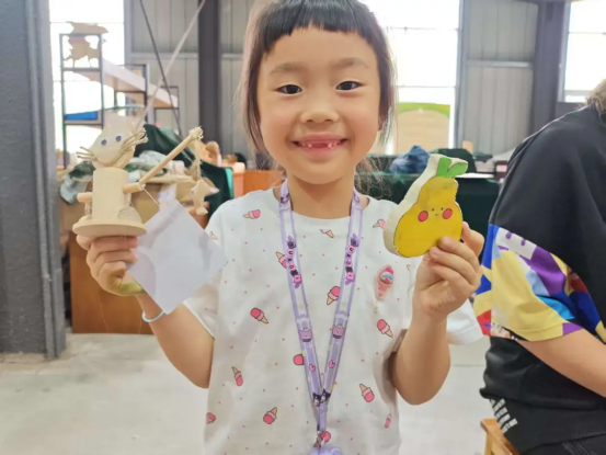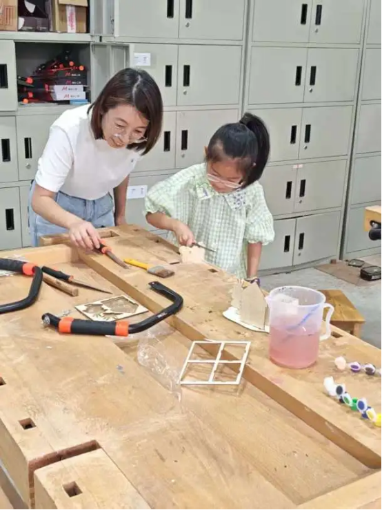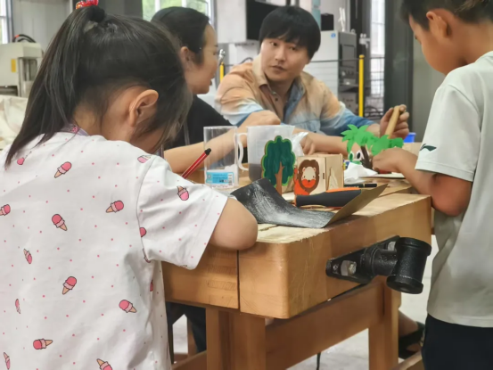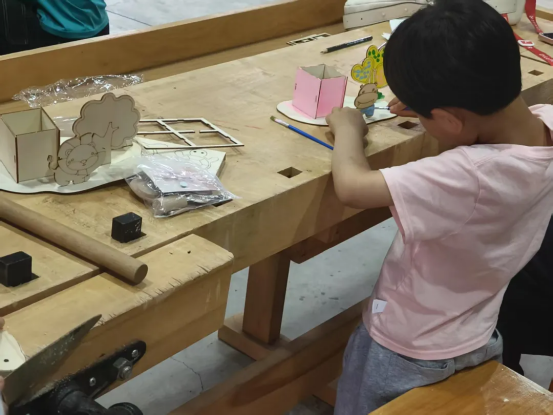 开放式的木艺设计让孩子主导,边角料和颜料都成了表达工具。孩子们抛开“标准答案”,用木料和颜料自由创作,家长从“指导者”变为“助手”,角色互换带来新体验,更加感受到小孩创意丰富的世界。